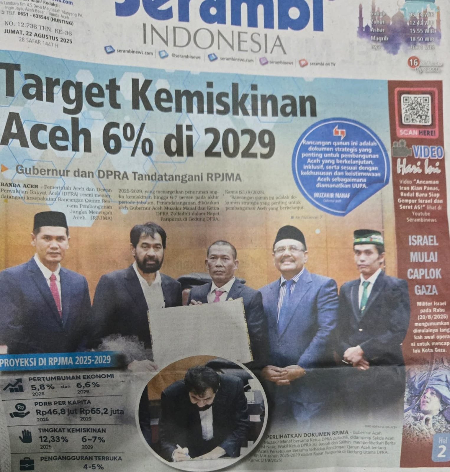 BANDA ACEH (Sabtu, 23/8/2025). Said Muniruddin, Rector Suficademic, mengomentari target penurunan kemiskinan Aceh dalam RPJMA 2025-2029. Kemiskinan Aceh diproyeksikan turun dari 12,33 persen pada tahun 2025, menjadi 6-7 persen pada tahun 2029. Berarti turun sekitar 1,3 hingga 1,5 persen pertahun.